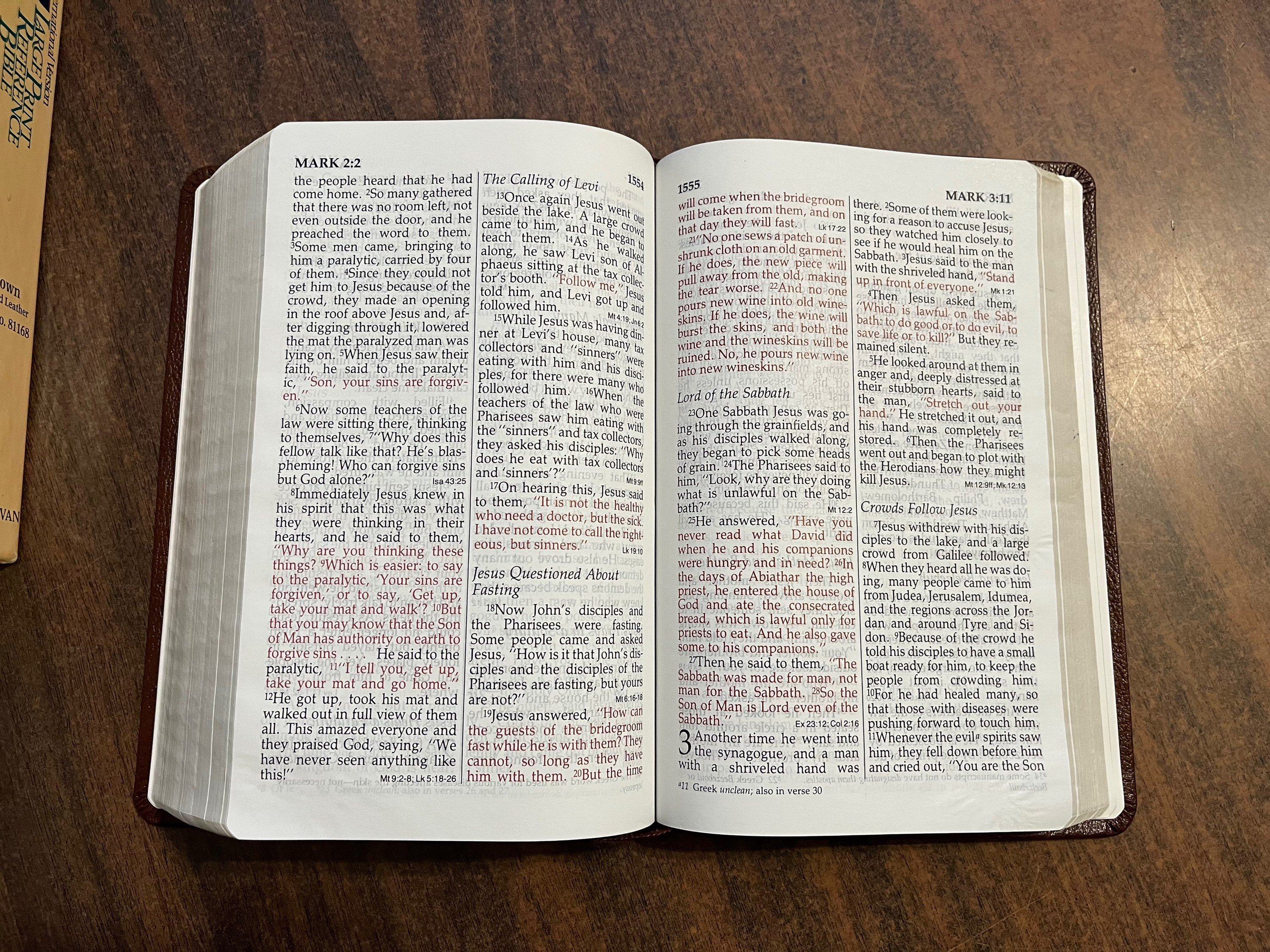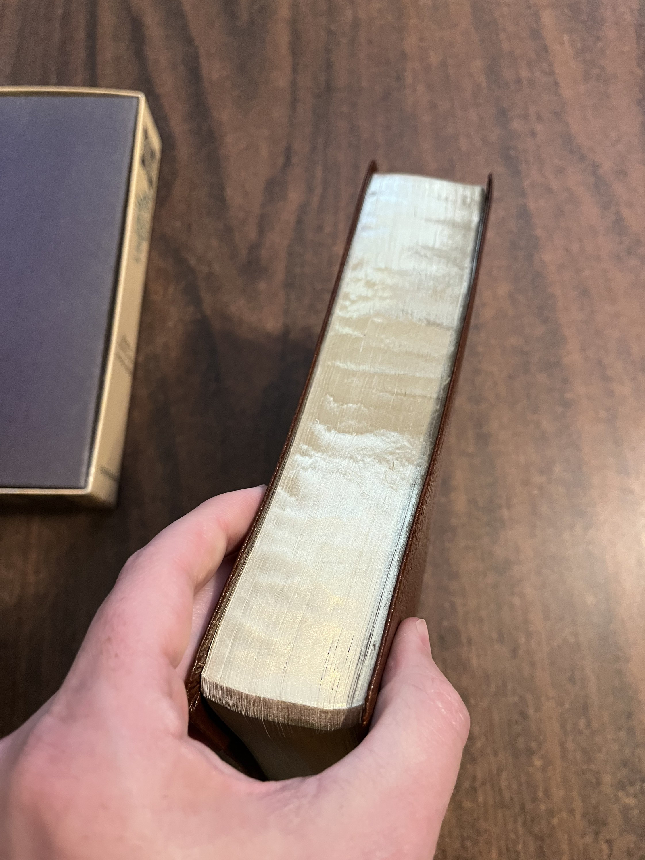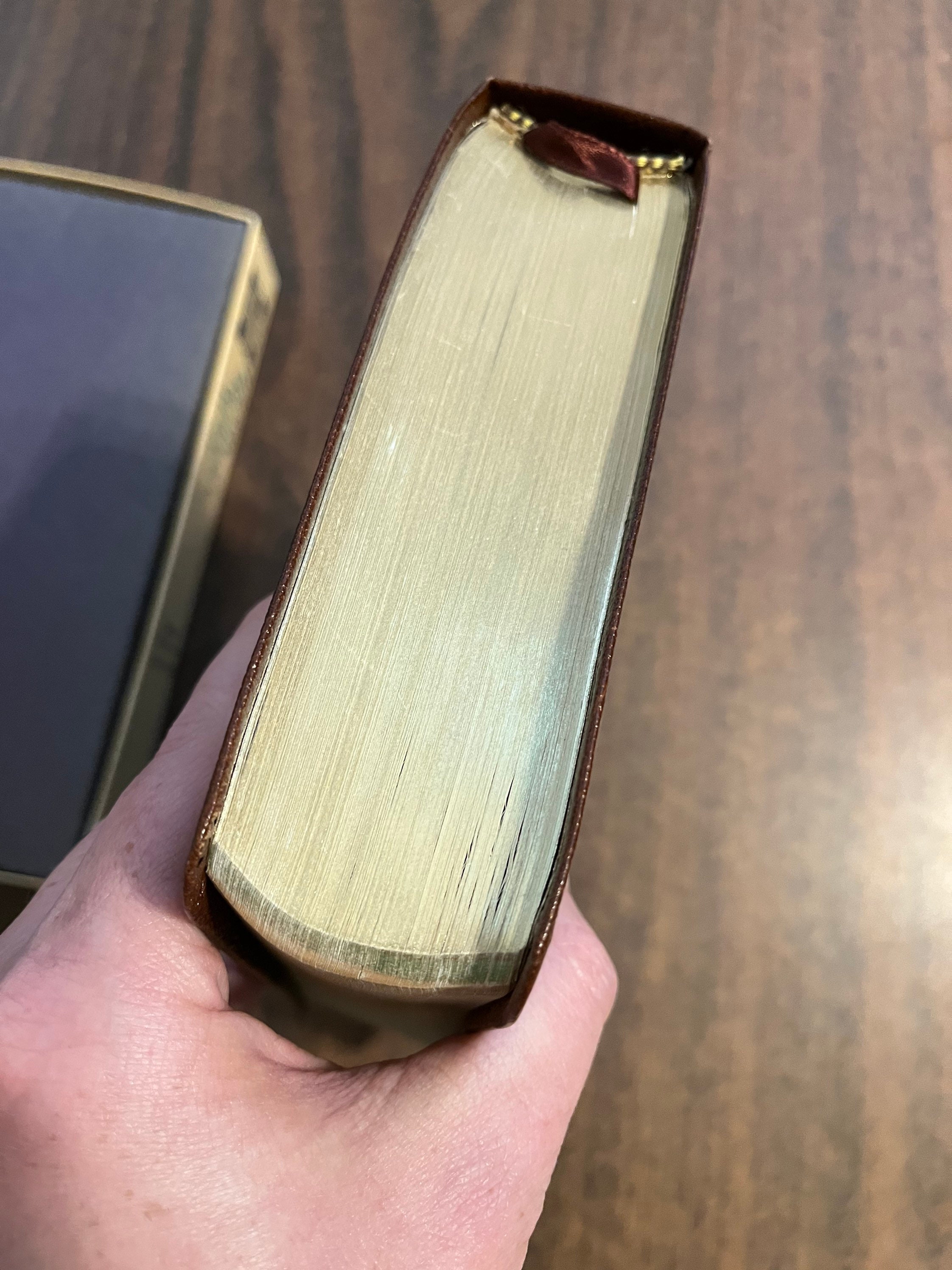 Appears that it probably had some minimal use. I couldnt find any markings in the text. Some pages have slight wave to them. Some wear at corners of spine