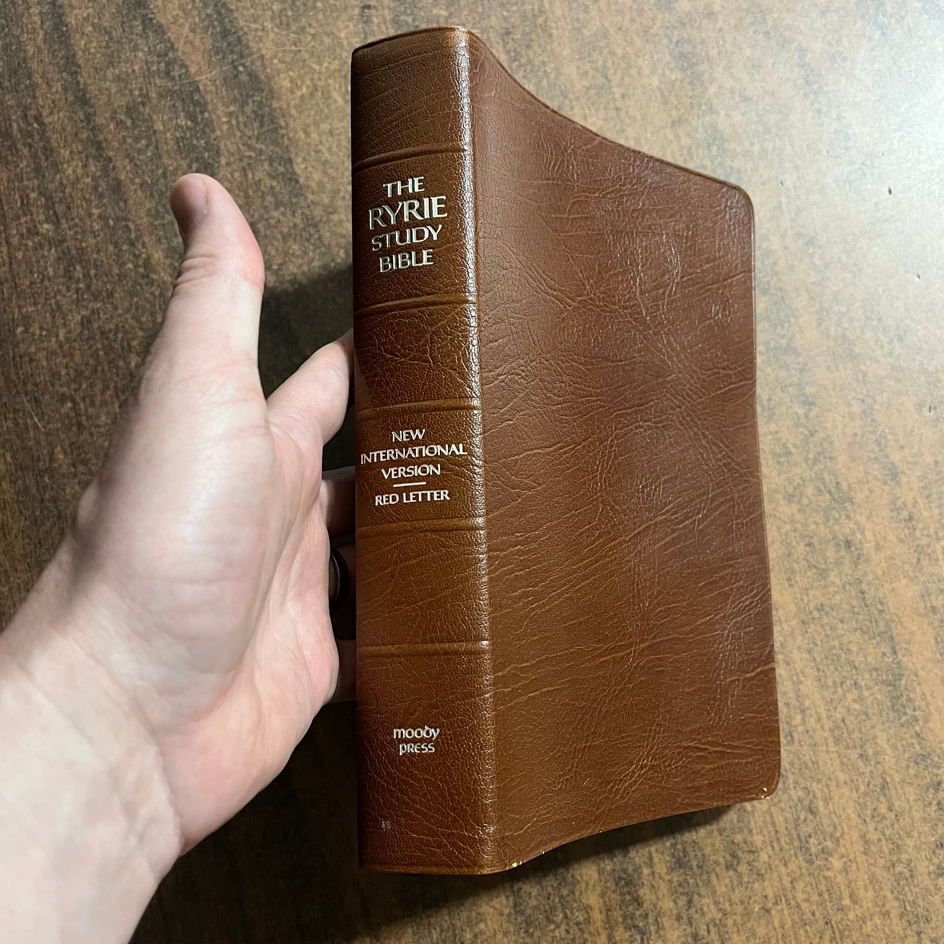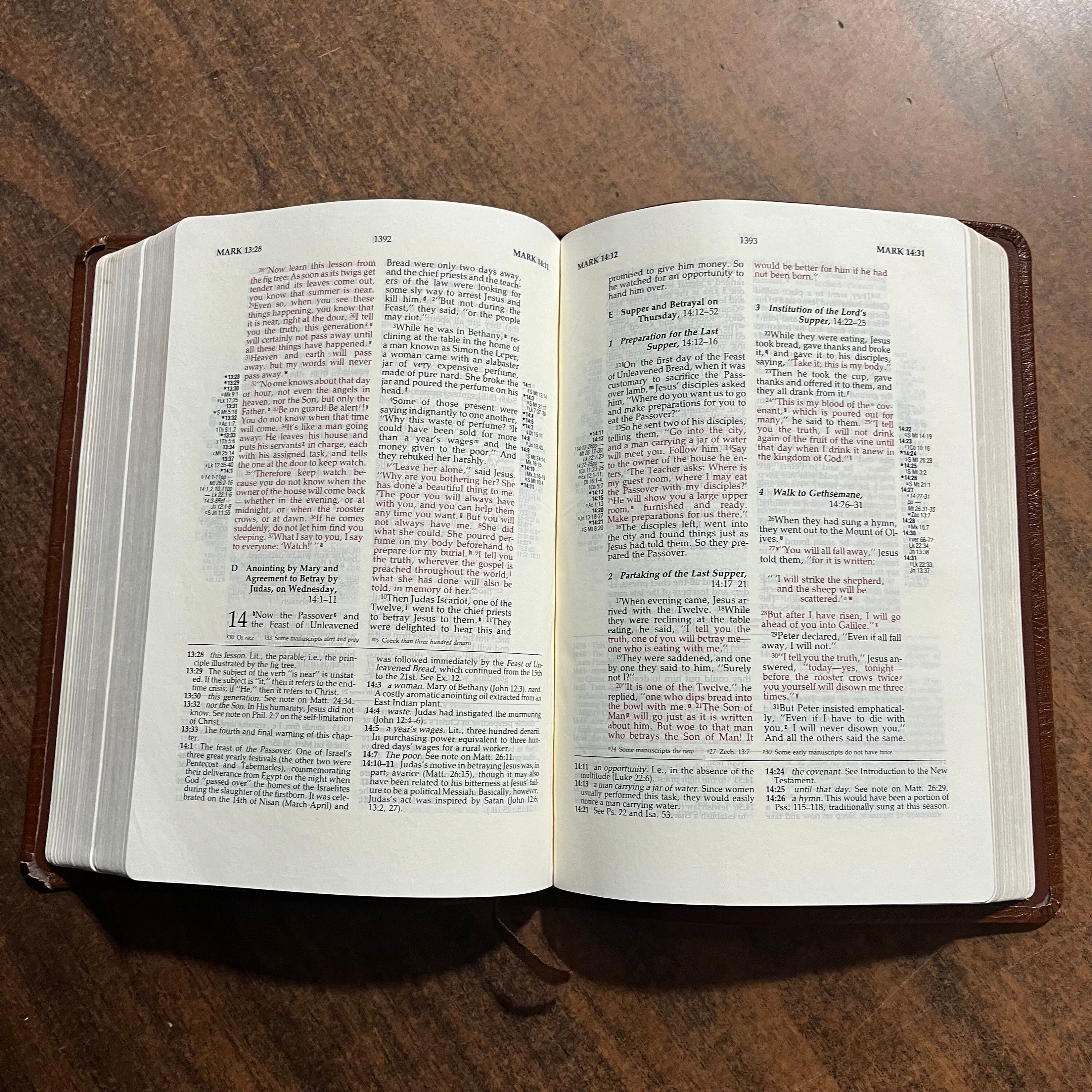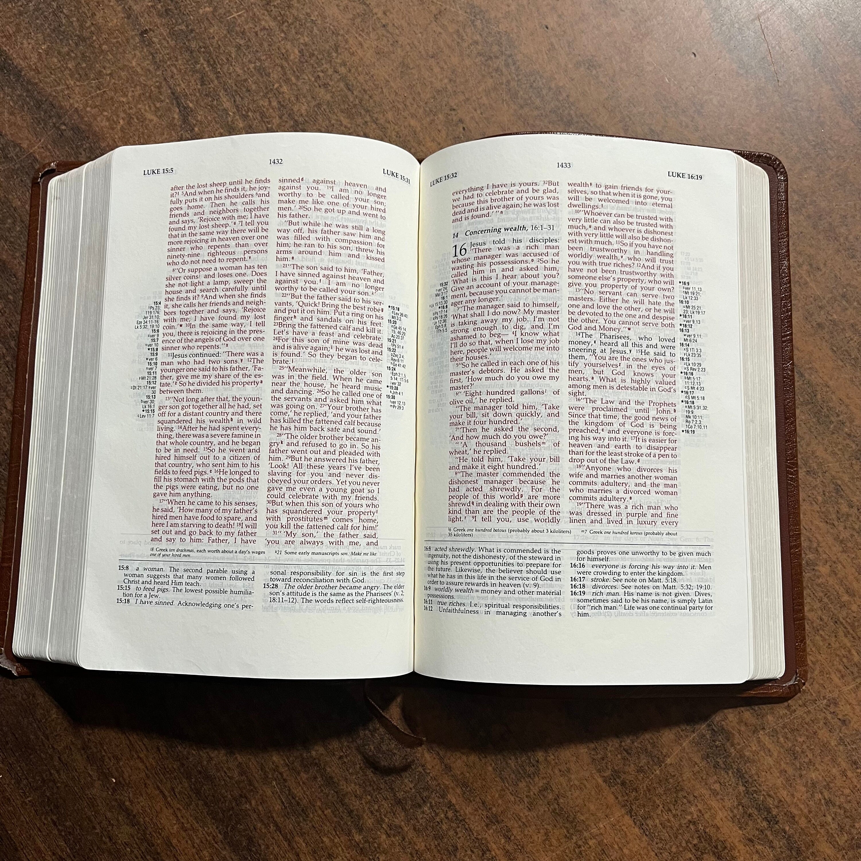 Used bible. I couldnt find any markings in the text. Has wear at side gilding and corners of spine. Inside corners of leather are coming up and need a big of glue to repair