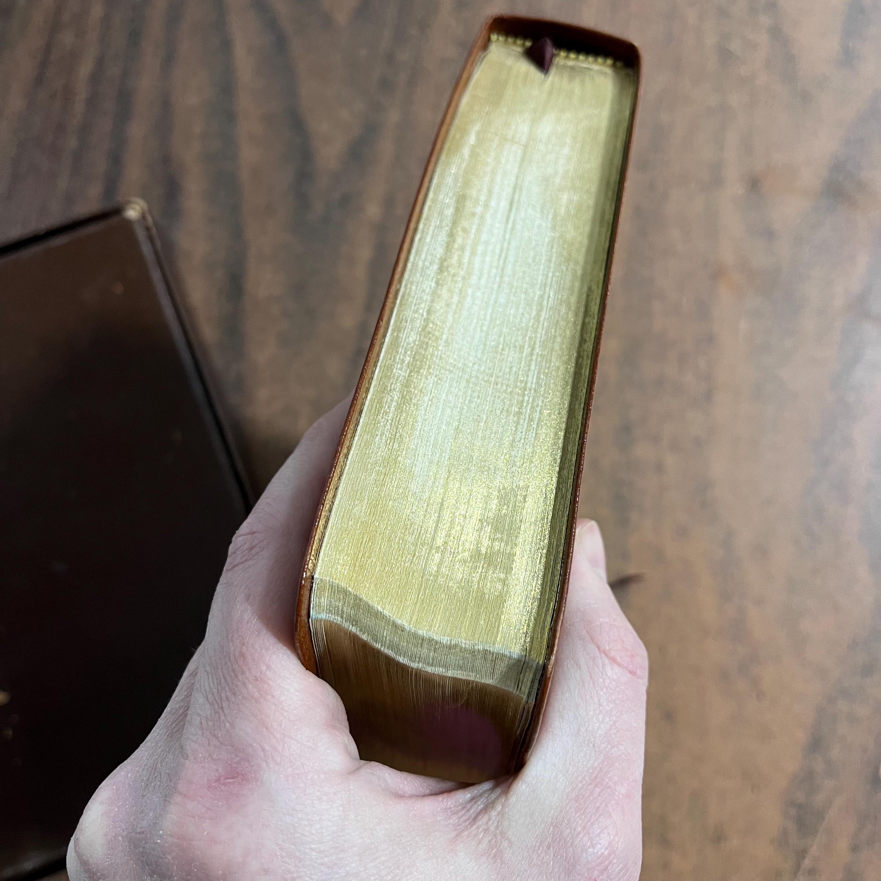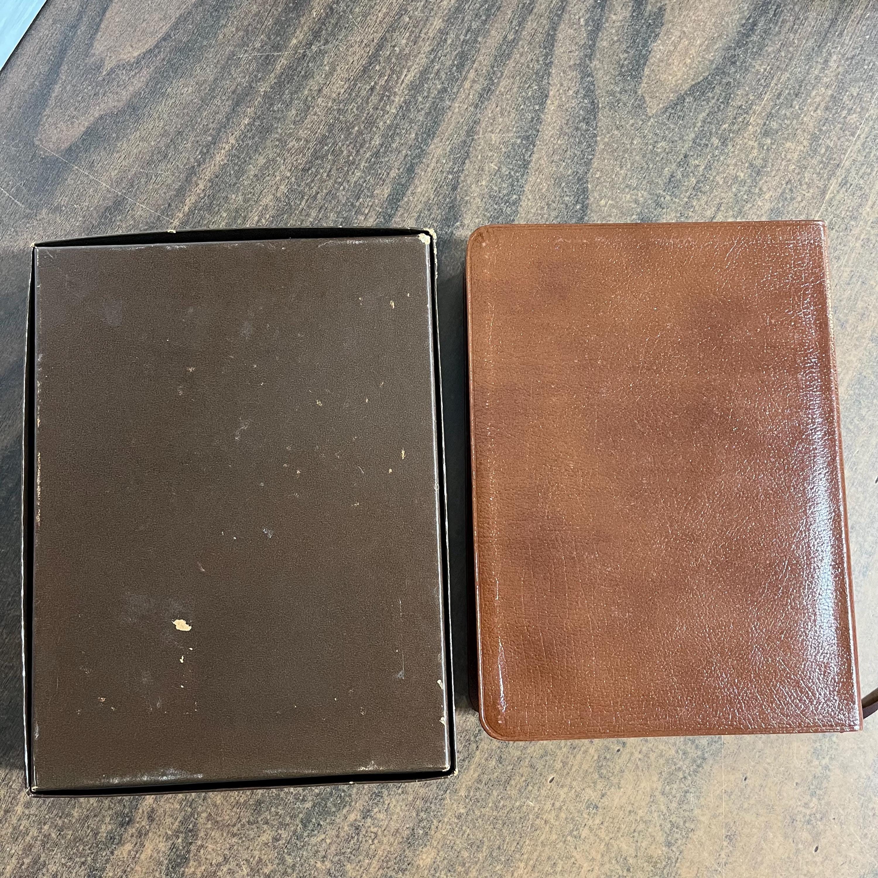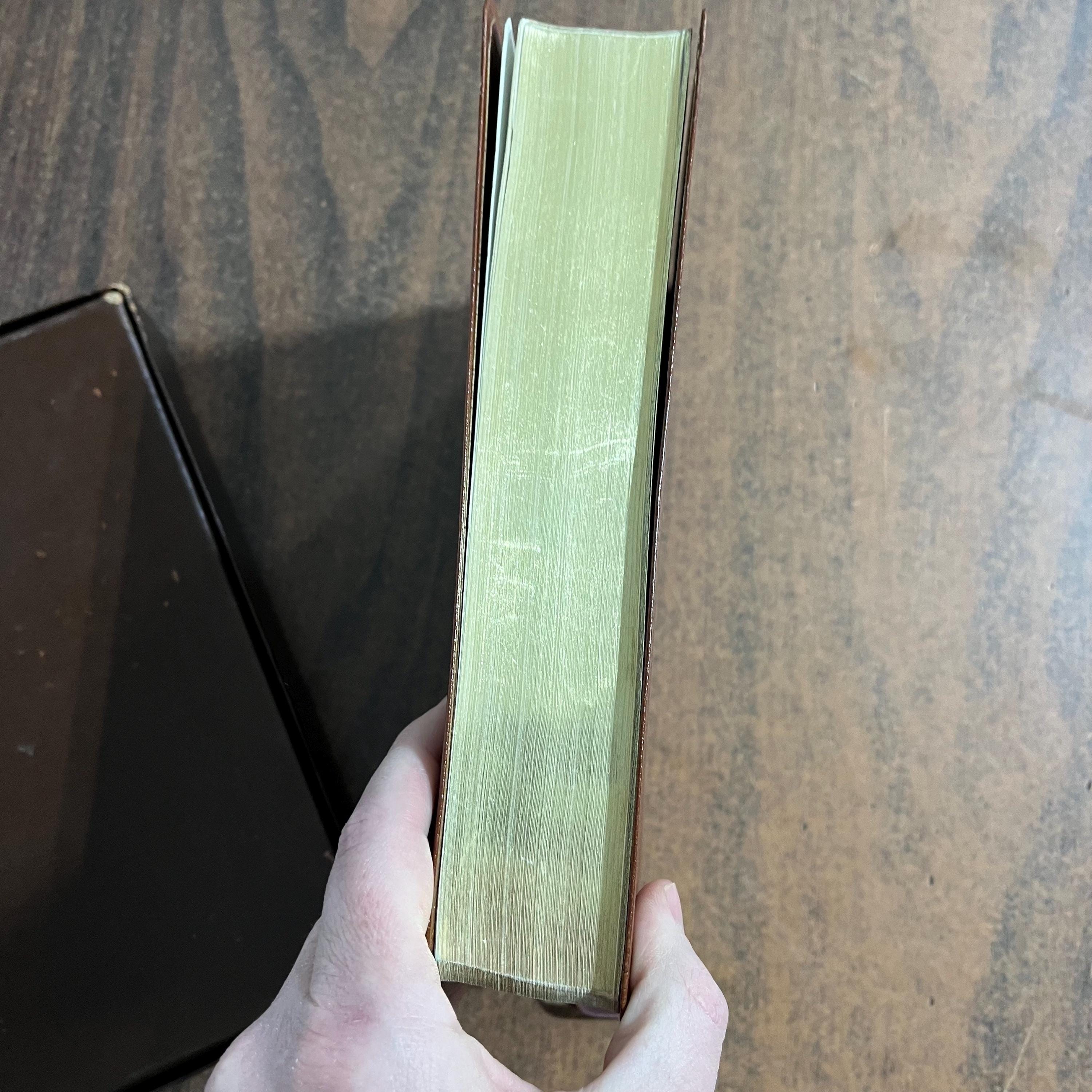 Appears nearly unused. Has minor rubbing at corners of spine. Has light dust smell. The lettering on the spine is worn, I believe just from rubbing against the box. Light wear to side gild. Name written in front, but I couldnt find any markings in the text
