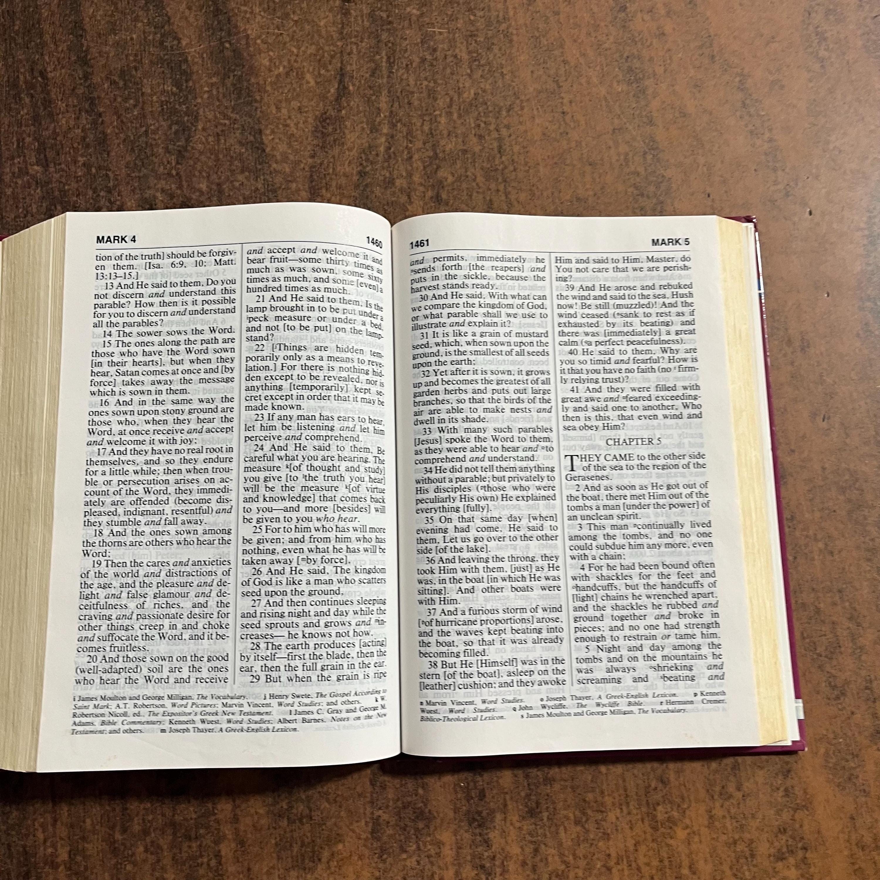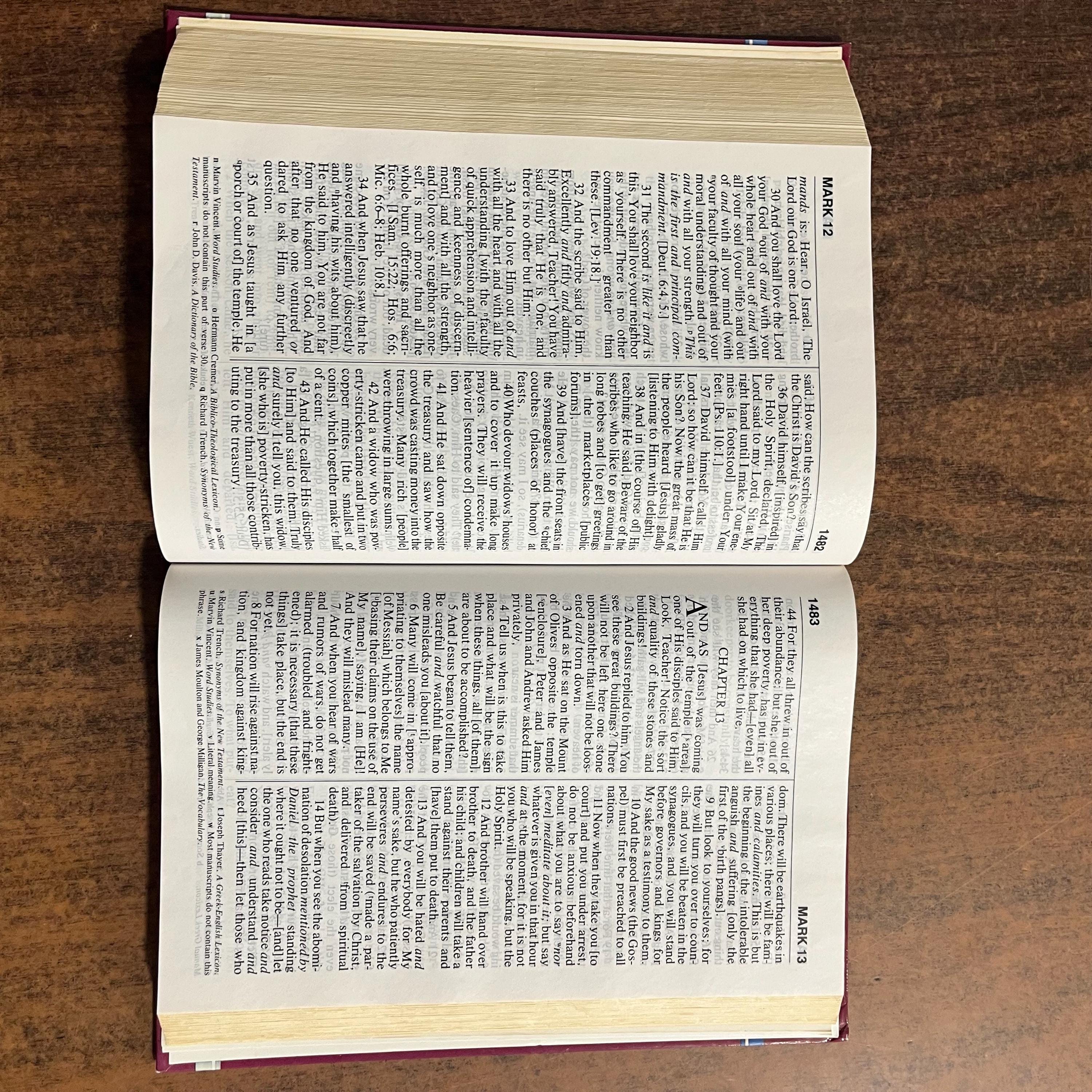 Bible has been used some. But I couldnt find any markings inside. The binding has some issues in both the front and back where cover attaches. Binding is showing and the copyright pages are loose