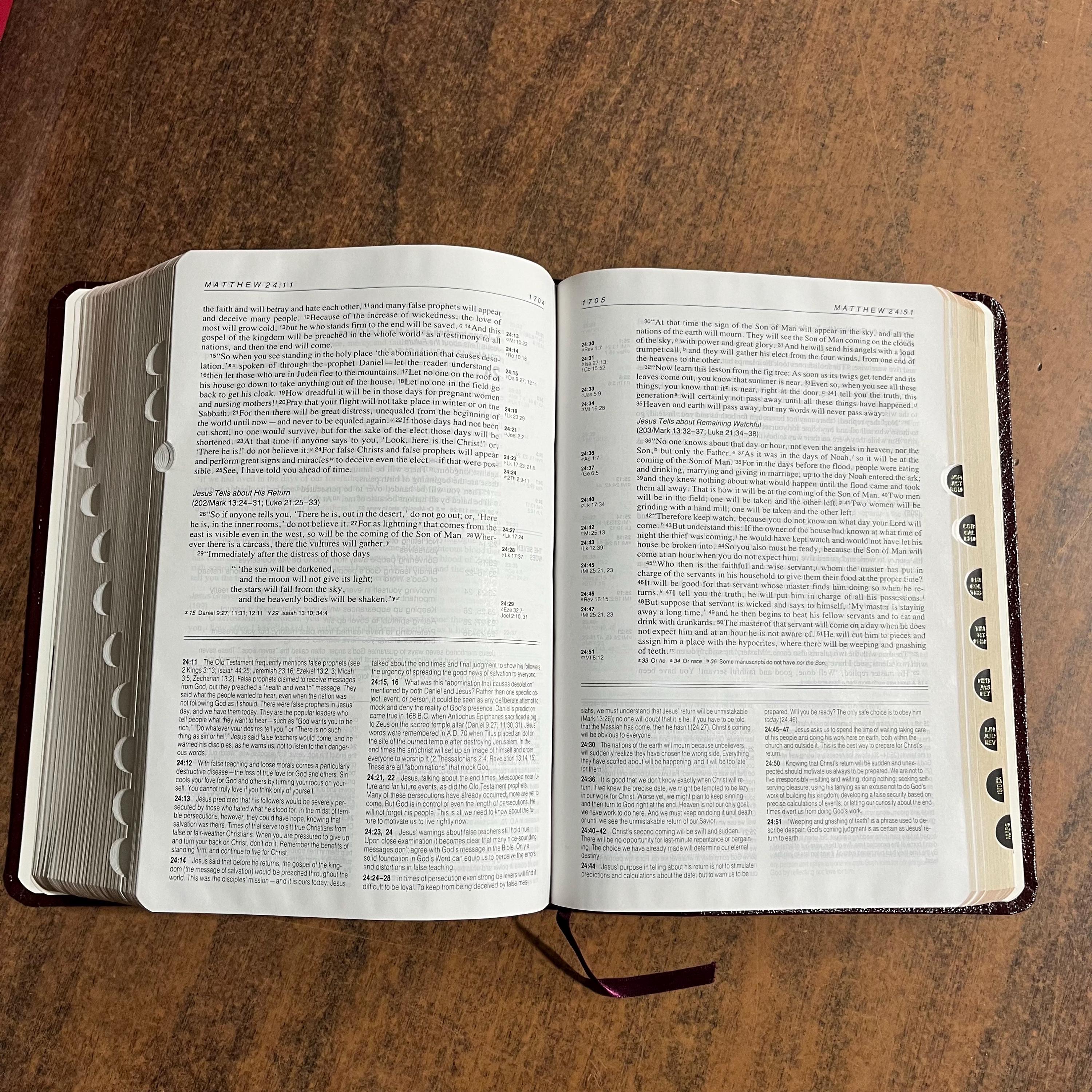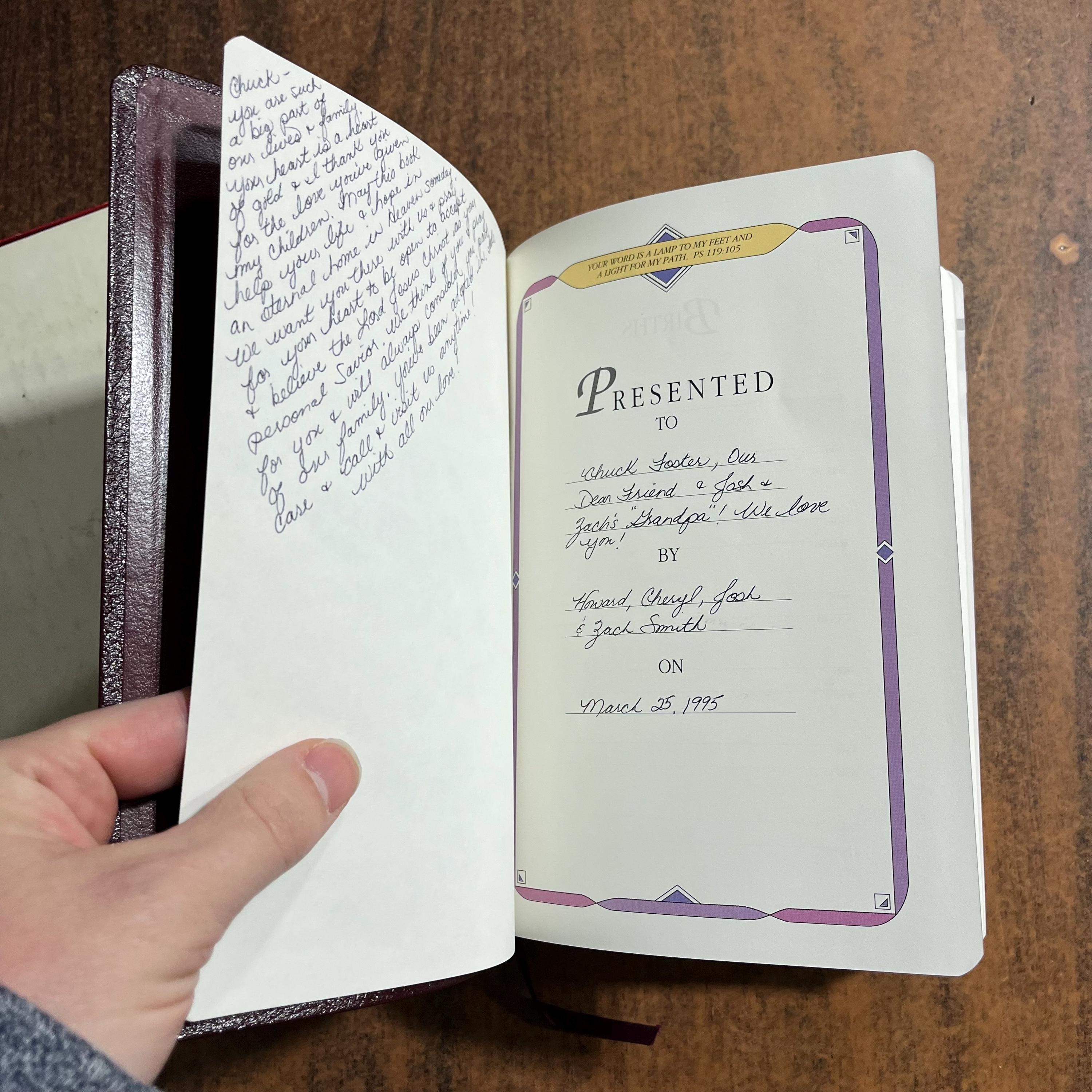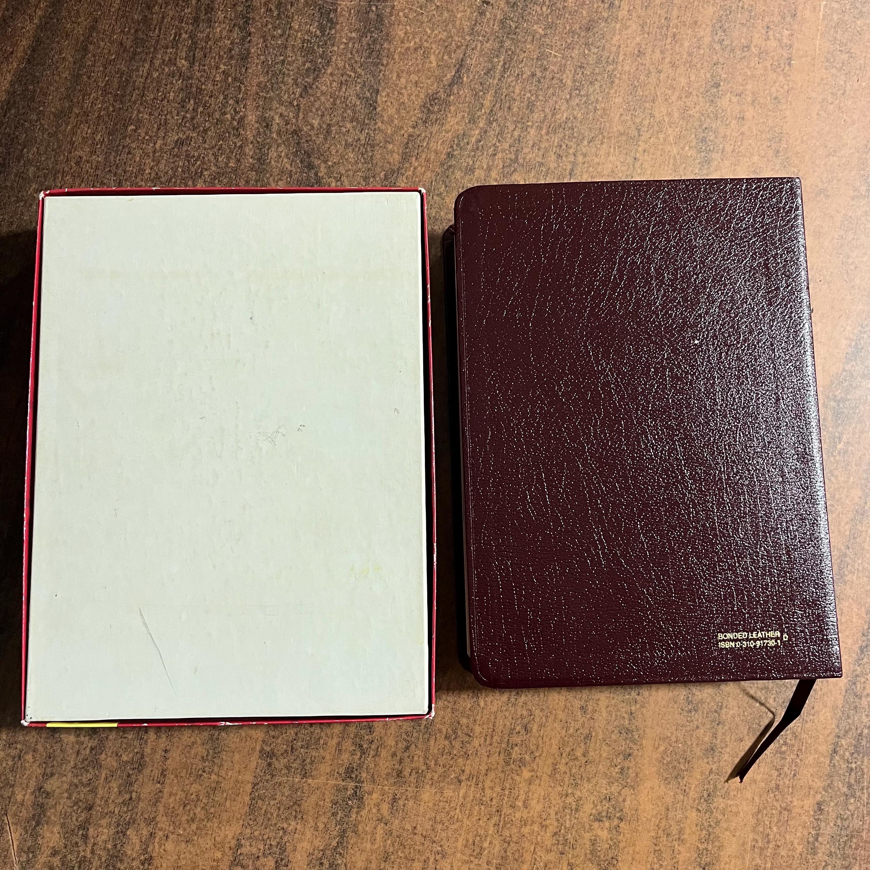 Appears like it hasnt been used. The presentation page is filled out and there is a long dedication in the front, but I couldnt find any markings in the text. There was also a name personalized on the front that has been professionally blocked out with the same machine used to put names on bibles