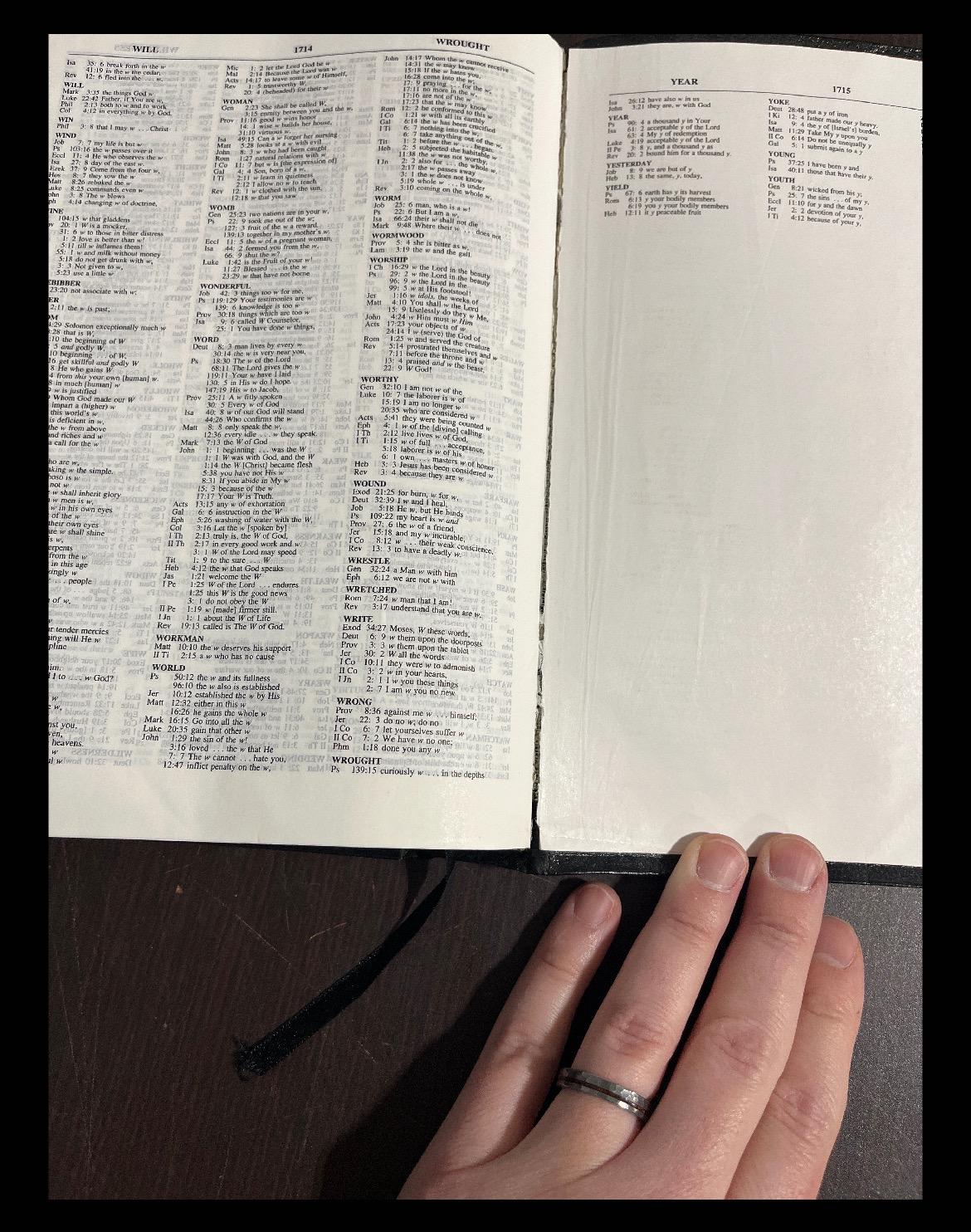Bible is used and has over all general wear. But I could not find any markings in the text. has some separation in binding in front and back