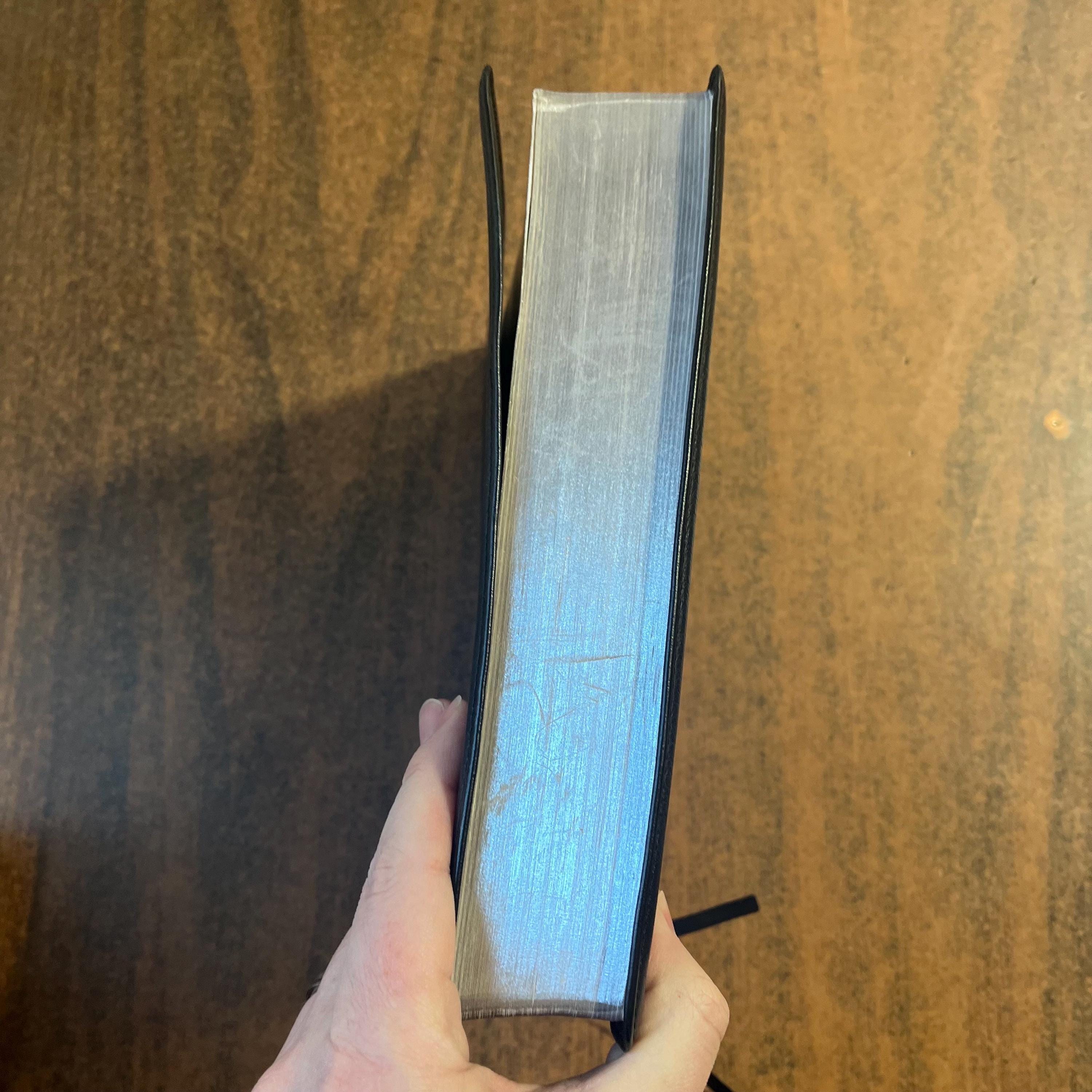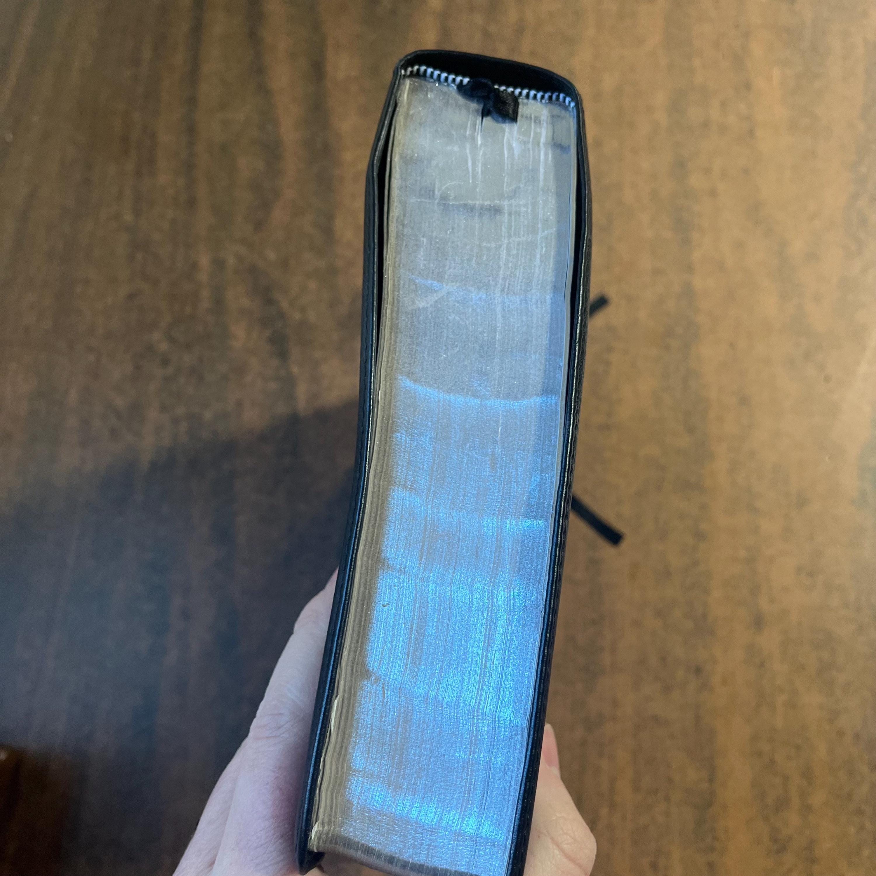 Bible has been used and has minor markings inside and overall general wear. The previous owner cut out the front dedication and liner pages. The leather cover is gaping when you bend it