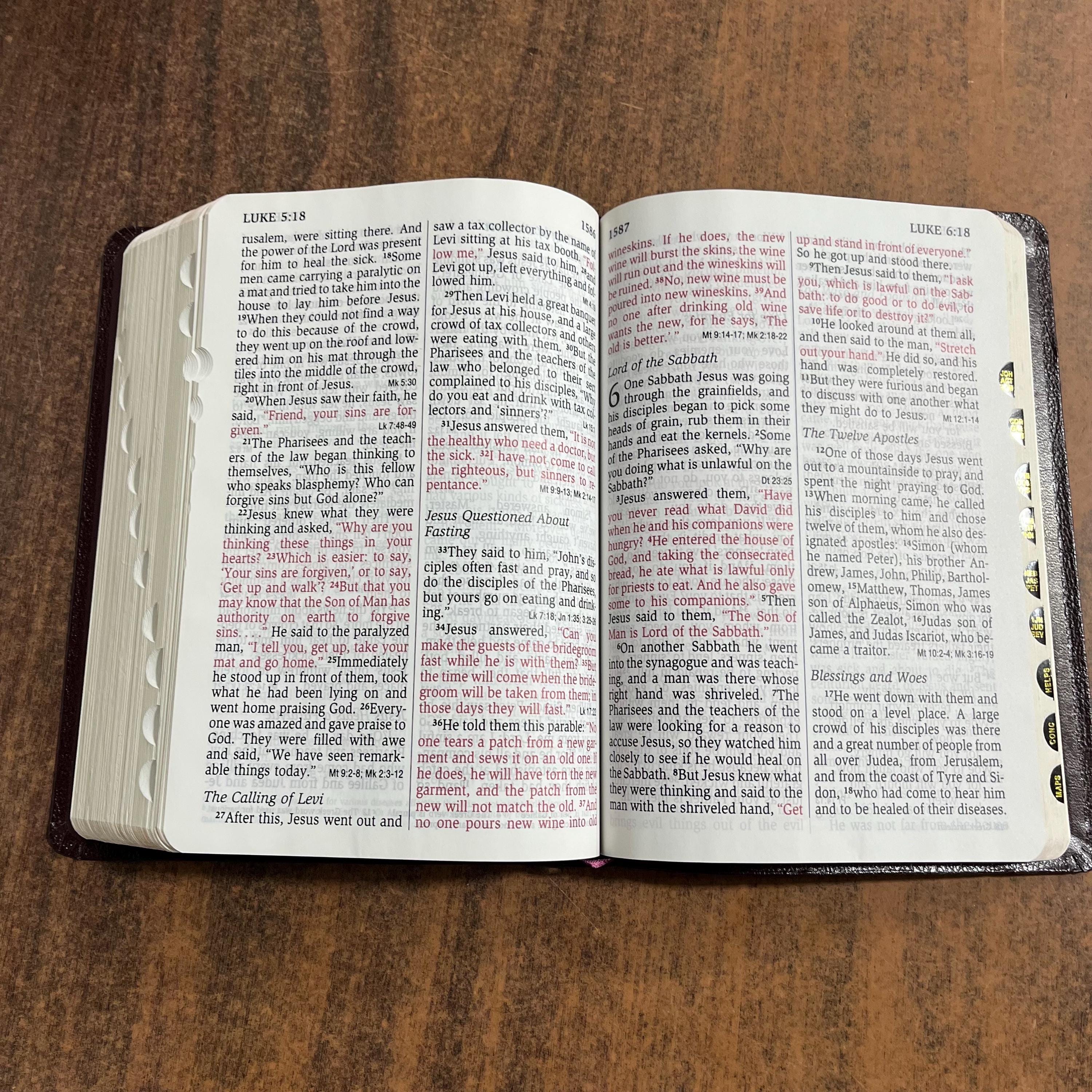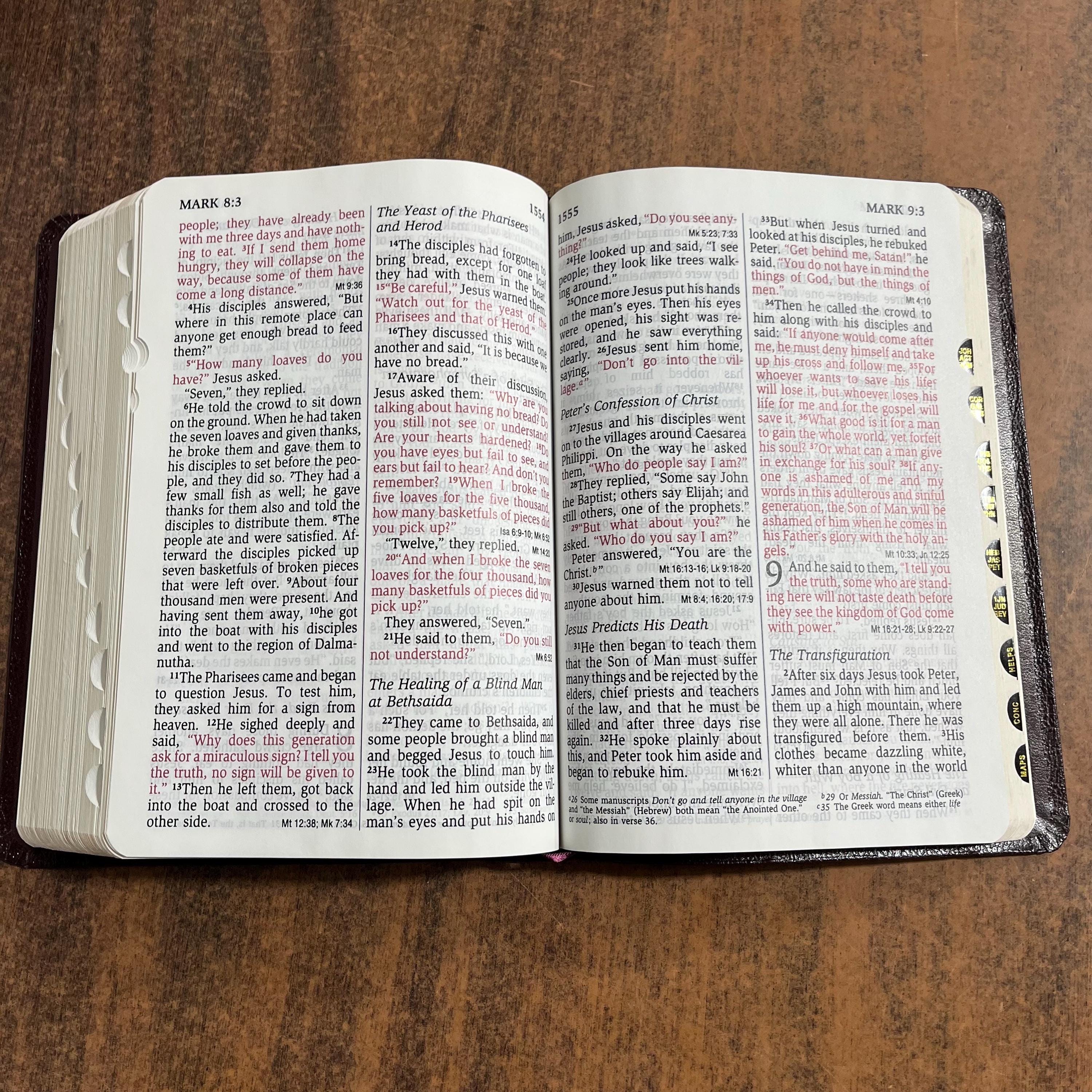 Bible appears to have only had minor use. I couldnt find any markings in the text. Had a name personalized on the front that has been professionally blocked over